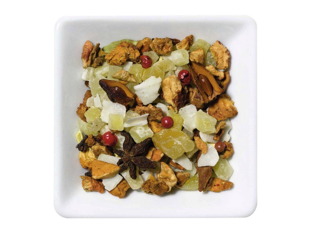 Složení: Mango kousky (mango, cukr, kyselina citronová) 55%, Jablko kousky, Kokosové lupínky, Badyán, Skořice, Kardamom, Zázvor, Lékořice kořen, Hřebíček, Pepř růžový, aroma